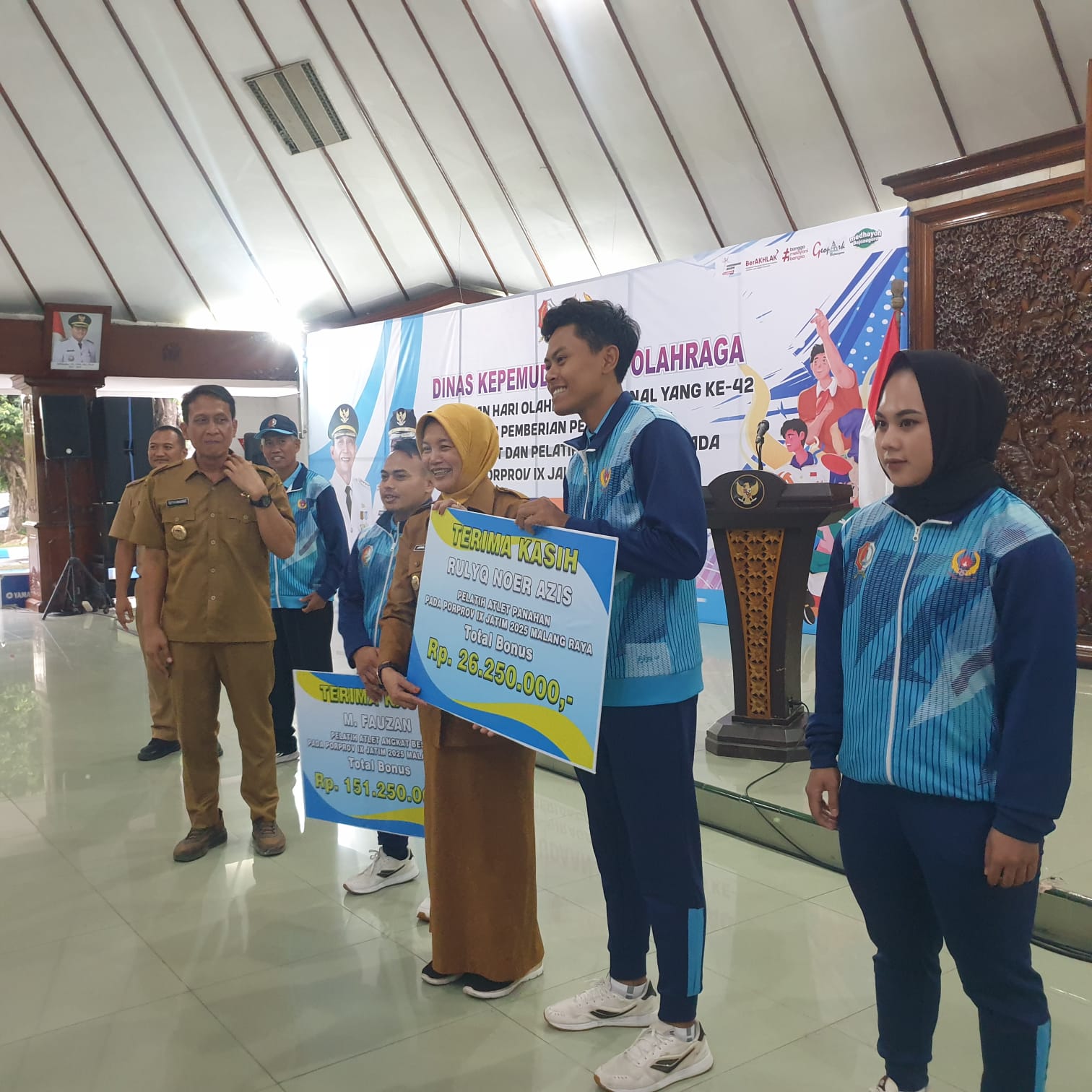 ‘’Ada seratus lima atlet yang menerima bonus atas raihan medali di Porprov tahun 2025 lalu’’ kata kepala Dinas kepemudaan dan Olahraga Arief Nanang saat memberikan laporannya. Dia menjelaskan untuk tiap emas yang diperoleh para atlet menerima Bonus sebedar Rp 35,8 Juta, Sementara Perak sebesar Rp 30,90 juta serta Perunggu sebesar Rp 26 juta.